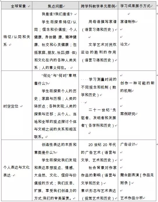 中學項目明確了要開展跨課程探索的16個重大概念。表格中顯示的這些重大概念出自中學項目的8個學科組,也代表著超越這些學科組界限的理解。