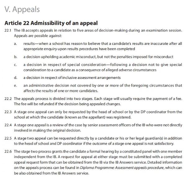 關(guān)于申訴,小伙伴們可以根據(jù)IBO給出的《General regulations: Diploma Programme》第22條成績申訴內(nèi)容聯(lián)系IB協(xié)調(diào)員等相關(guān)人員進(jìn)行申訴。