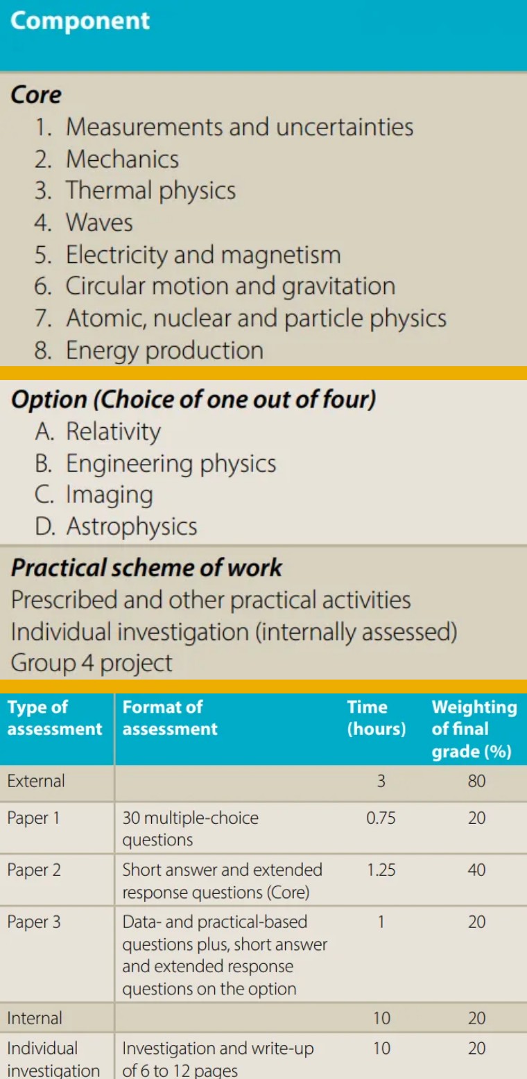 SL物理總學(xué)時(shí)150小時(shí),要求有30小時(shí)的物理實(shí)驗(yàn)和10小時(shí)的跨學(xué)科項(xiàng)目。HL物理總學(xué)時(shí)240小時(shí),要求有50小時(shí)的物理實(shí)驗(yàn)和10小時(shí)的跨學(xué)科項(xiàng)目。實(shí)驗(yàn)時(shí)間不包括學(xué)生書(shū)寫實(shí)驗(yàn)報(bào)告的時(shí)間。